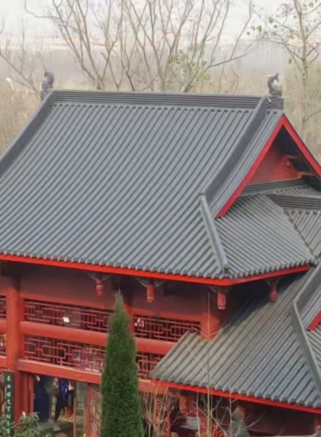 如今,改造后的绵阳寺庙焕然一新。覆盖着西安鹏航 3 号仿古金属瓦的屋面,在阳光下熠熠生辉,与飞檐斗拱、红墙金顶相互映衬,完美还原了古建的神韵与风采。全新的屋面不仅彻底解决了漏水、老化等问题,更以其卓越的品质与美观的外观,提升了寺庙的整体形象,成为绵阳古建保护与现代工艺融合的典范之作。西安鹏航金属科技有限公司凭借优质的产品、专业的服务和个性化的解决方案,赢得了寺庙方的高度赞扬与认可,也为中式庭院、别墅住宅、文旅建筑等领域的屋面改造提供了成功范例。